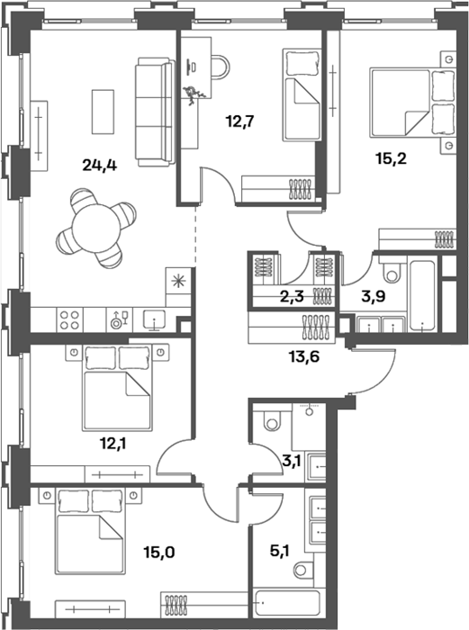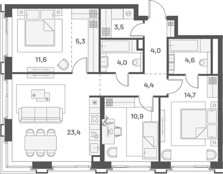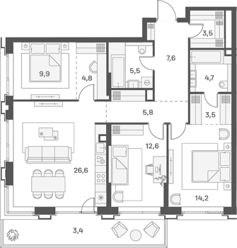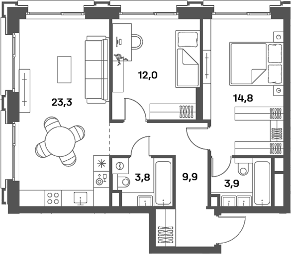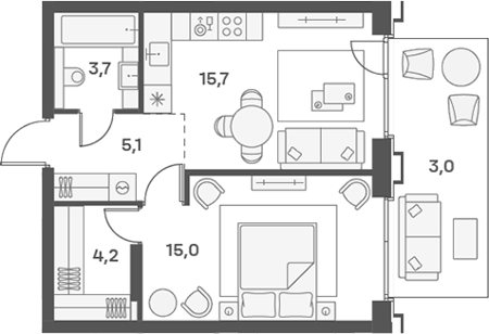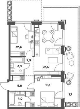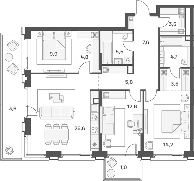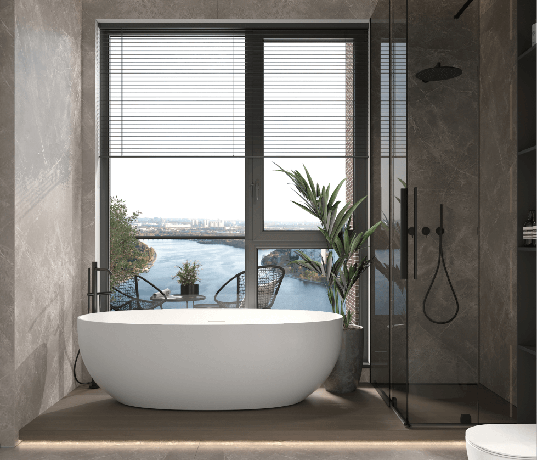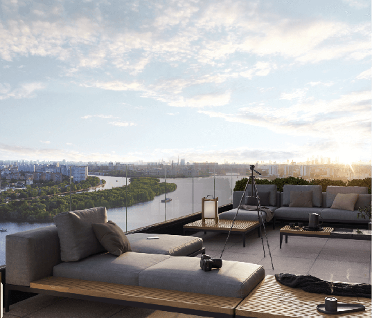 Студия, но с панорамным балконом. Двушка, но с угловыми окнами в гостиной. Трёшка, но с гигантской видовой террасой и мастер-спальней. Балконы с панорамным остеклением, только парящие над водой. Ванная, конечно, с панорамой на реку. Просторные пентхаусы, собравшие всю коллекцию преимуществ и топовые виды