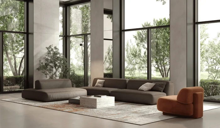 Главное лобби с панорамными окнами с видом на пышные сады, площадью 460 м2 и высотоой потолков — 4,3 м;