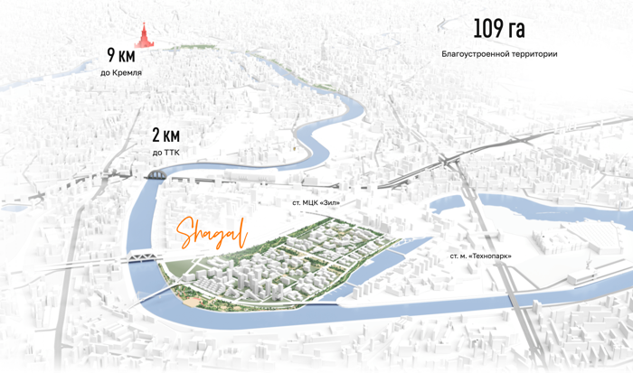 Квартал Shagal — первый в Москве район, который строится по принципу «15-минутного города». Это город коротких расстояний, где в пределах 15-ти минут каждый житель сможет дойти от своего дома до всех необходимых общественных пространств, будь то парк, детский сад, офис или супермаркет
