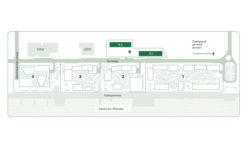 Жилой квартал прилегает к парку Северного речного вокзала площадью 49 га. Это исторический парковый комплекс. После благоустройства здесь появилось 11 детских и спортивных площадок, в том числе для стритбола, пинг-понга, шахмат и воркаута
