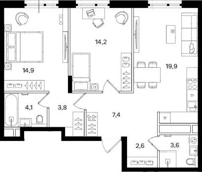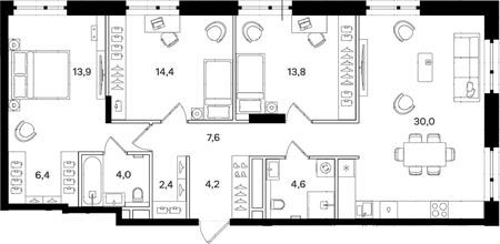 Квартирография от компактных студий до 4-комнатных квартир. Планировками предусмотрены просторные кухни-гостиные и обязательная гардеробная при входе. Также есть уникальные форматы с собственной террасой, отдельным входом со стороны парка и возможностью обустройства собственного палисадника