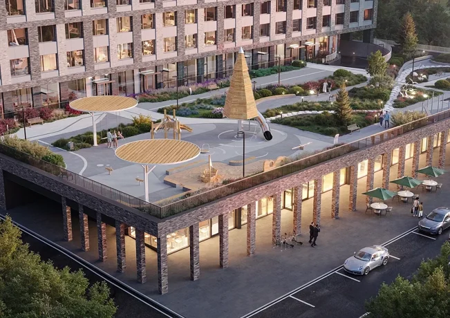 На территории комплекса — модные рестораны и кафе, магазины, аква- и фитнес-центр, школа на 825 мест и детский сад на 150 мест