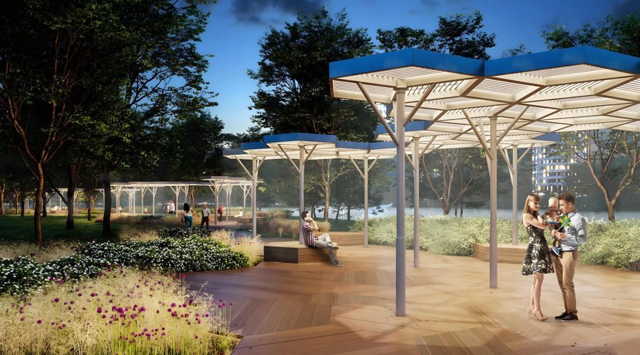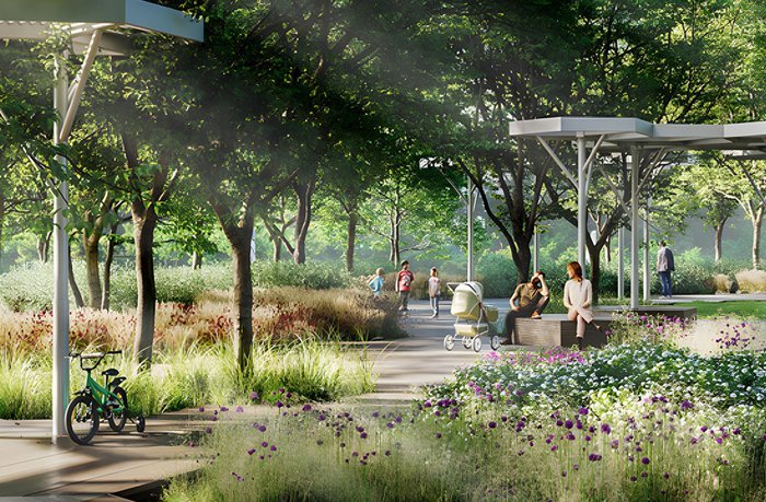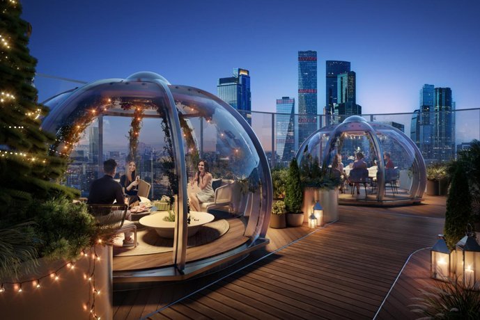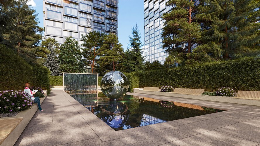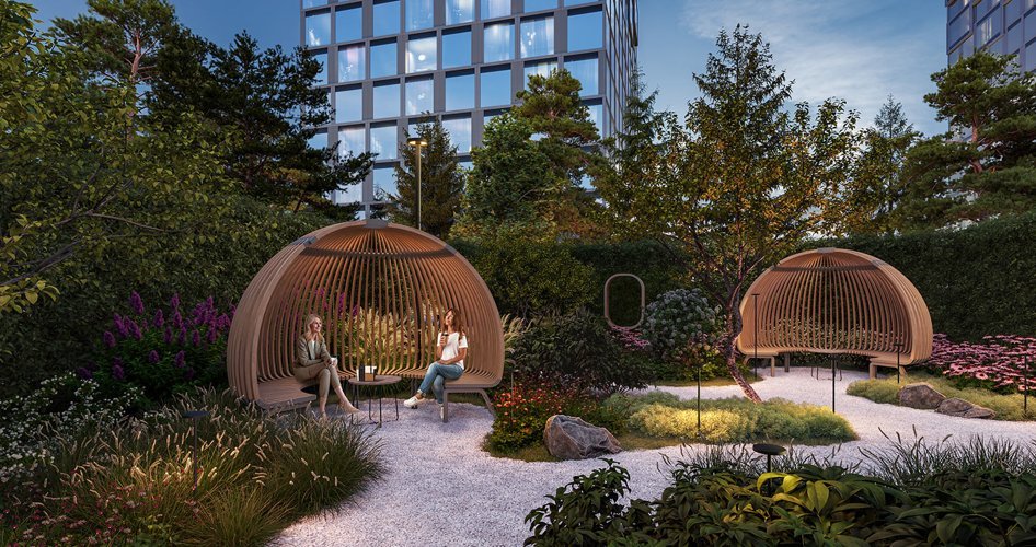 Пока башни вдохновляются мегаполисом, личный парк на крыше стилабата воспевает природу. Площадь внутреннего двора 2 га. Взрослые деревья, медитативная гладь пруда и лаунжи с зеркальными арт-объектами создают атмосферу умиротворенного леса