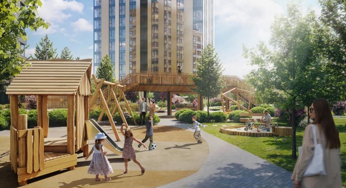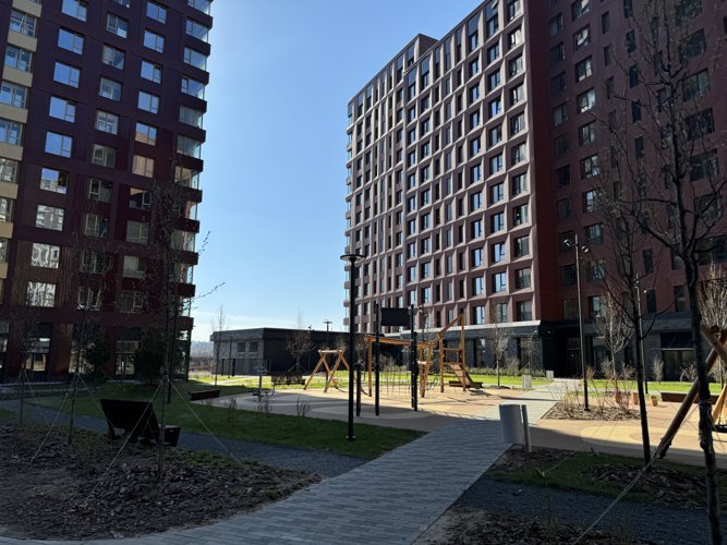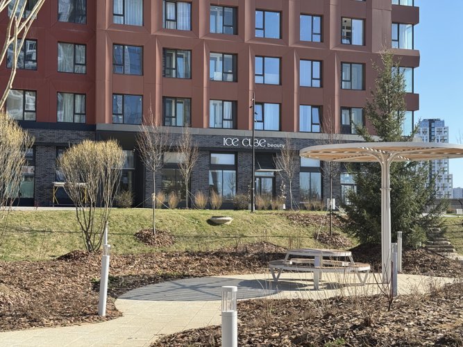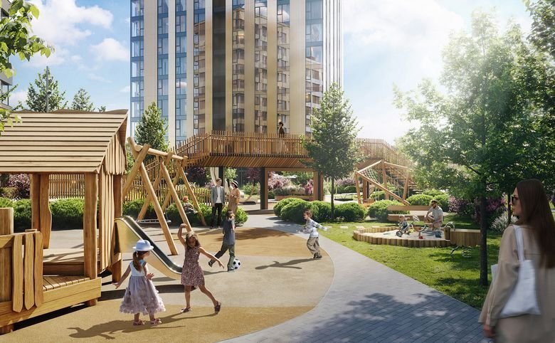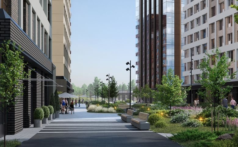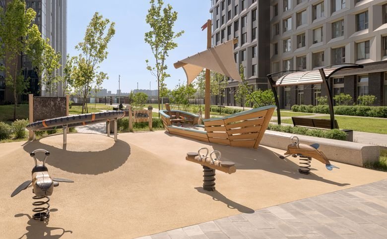 Комфортные внутренние дворы предназначены только для жителей, что обеспечивает максимальную безопасность. Здесь создан естественный ландшафт с небольшими возвышенностями и дорожками для прогулок. Детские площадки с безопасным покрытием и оборудованием из натуральных материалов зонированы по возрастам, чтобы малыши могли играть отдельно от подростков