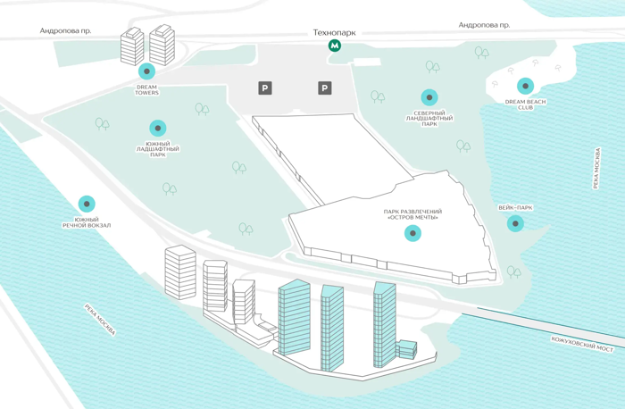 Комплекс находится находится на Нагатинском полуострове на 1-ой береговой линии Москвы-реки, В шаговой доступности пляжный клуб Dream Beach Club с бассейнами, яхт-клуб Dream Island Marina, вейк-клуб Dream wake park, рестораны с видом на воду, магазины, фитнес-центр, спа-салон и крупный ТЦ. Рядом «Остров Мечты» — крупнейший крытый парк аттракционов