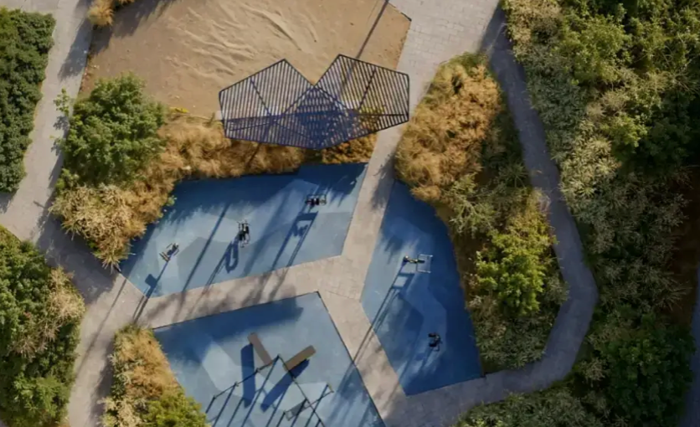 Приватный двор-парк площадью 3 га, с велосипедными и пешеходными дорожками, высокими деревьями и кустарниками, детскими площадками для разных возрастов, «зелёными кабинетами», площадкой для йоги, спортивной площадкой, центральной площадью, зоной открытого солярия, коворкинг-пространством, площадками для настольных игр и выгула собак и детский ландшафтный лабиринт