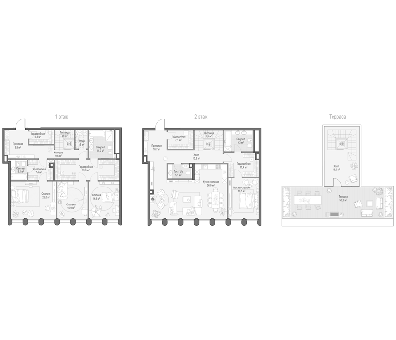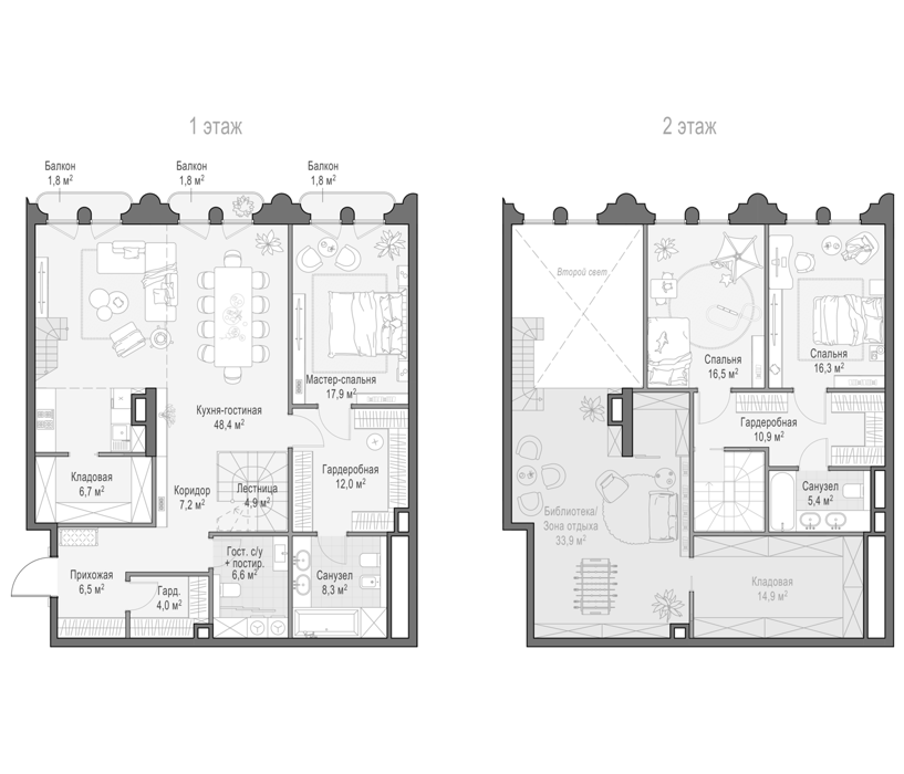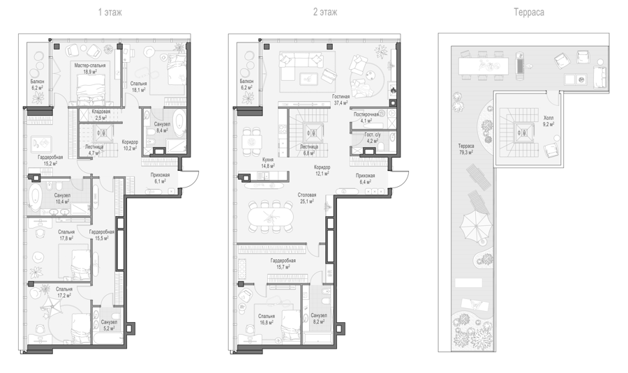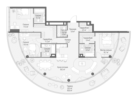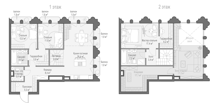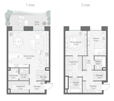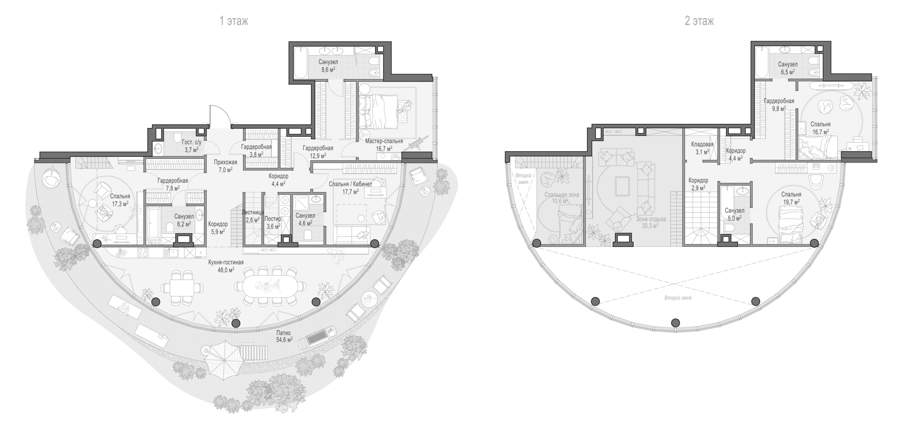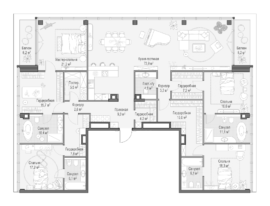 В клубных домах роскошный выбор форматов жилья на самый взыскательный вкус. Благодаря панорамным окнам, балконам, лоджиям и террасам открываются живописные виды на центр: Кремль, Москву-реку, Нескучный сад и парк Горького — и на витражный парк под соснами