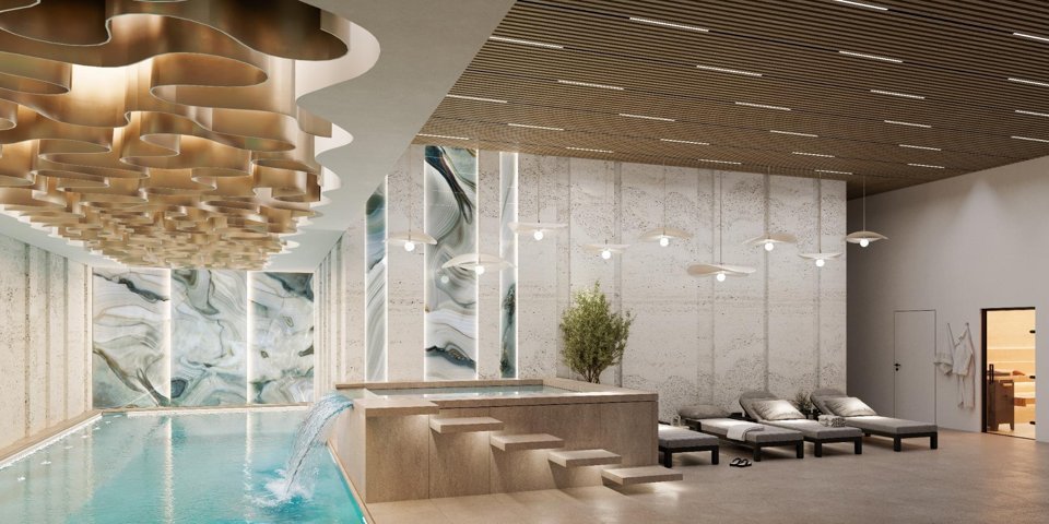 Пространство фитнес-зала занимает 1300 кв. м на двух этажах. На подземном этаже 25-метровый бассейн для спортивного плавания, детский бассейн, спа с хот-табом, сауной и хаммамом. На втором этаже — тренажёры на все группы мышц и зона кардио с видом на парк